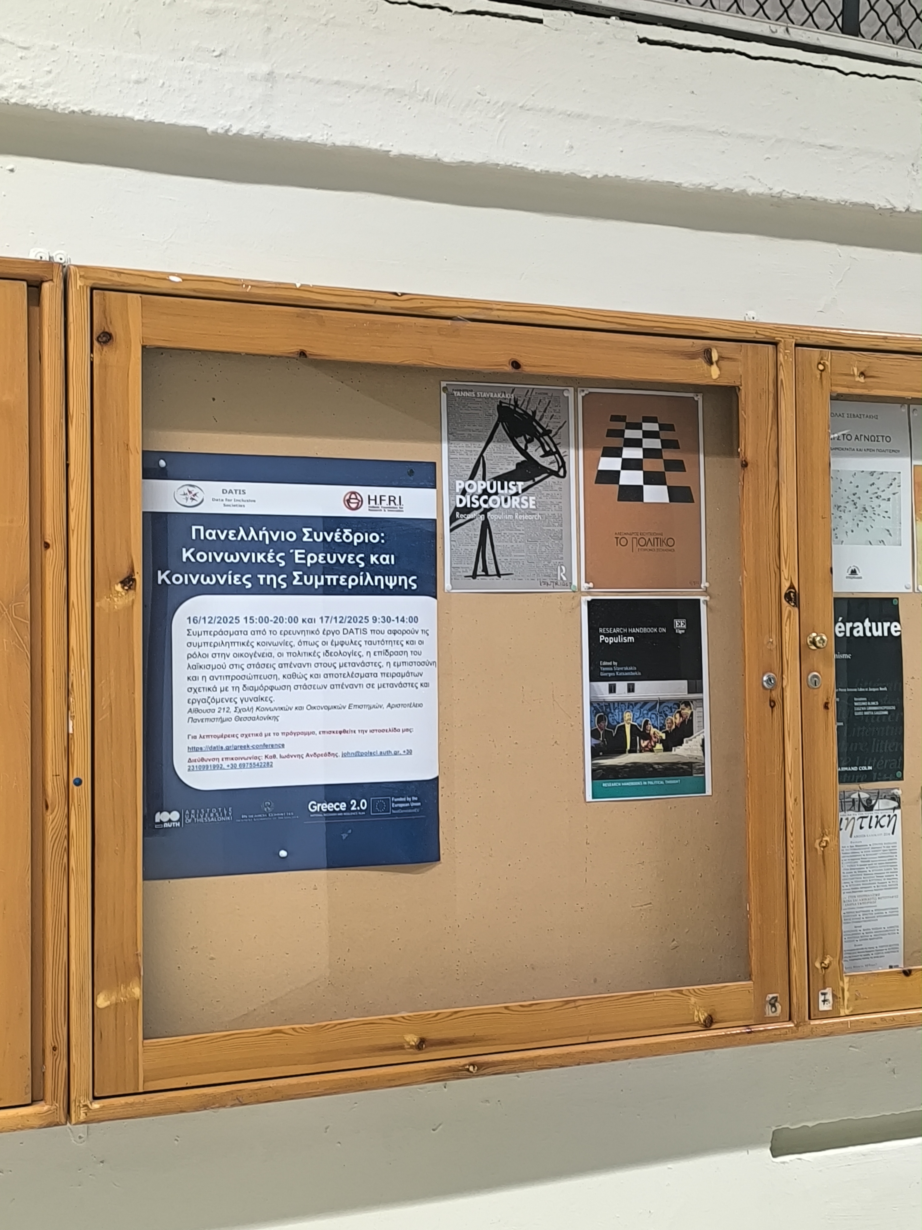 Στιγμιότυπα από το Πανελλήνιο Συνέδριο «Κοινωνικές Έρευνες και Κοινωνίες της Συμπερίληψης», που διοργανώθηκε με επιτυχία στο Αριστοτέλειο Πανεπιστήμιο Θεσσαλονίκης στα πλαίσια του ερευνητικού έργου DATIS. Ευχαριστούμε θερμά όλους τους ομιλητές και τους συμμετέχοντες για τον γόνιμο επιστημονικό διάλογο και τη συμβολή τους στην ανάδειξη κρίσιμων ζητημάτων κοινωνικής συμπερίληψης.